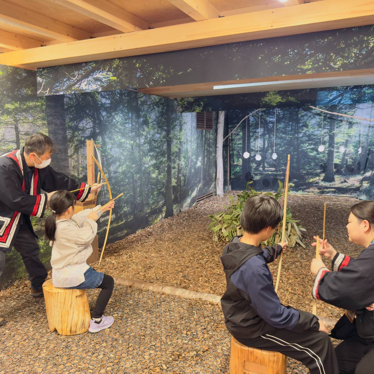 資料館などを見て周り、時間的に体験できるコーナーが終わりかけている中で『【弓矢】がまだ出来ますよ。』と、声をかけてもらえたので子供達が体験です。