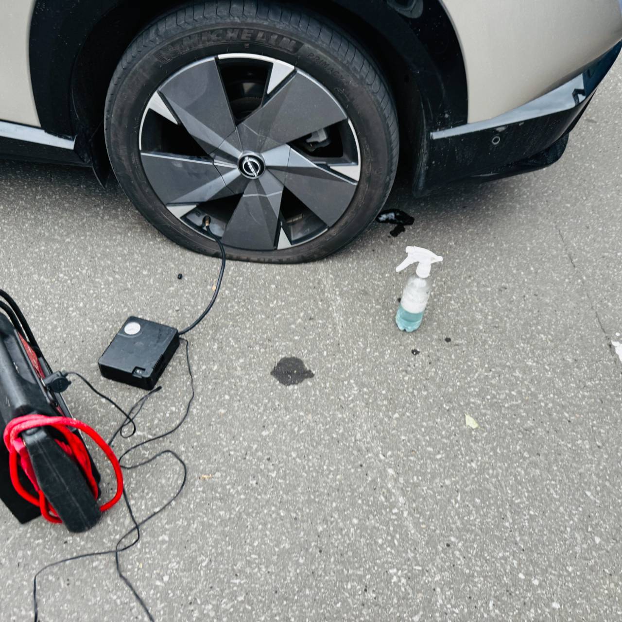 知人を乗せて走行中にタイヤ空気圧の警告灯が点灯し出して、どんどん空気圧が低下していってしまいました。
